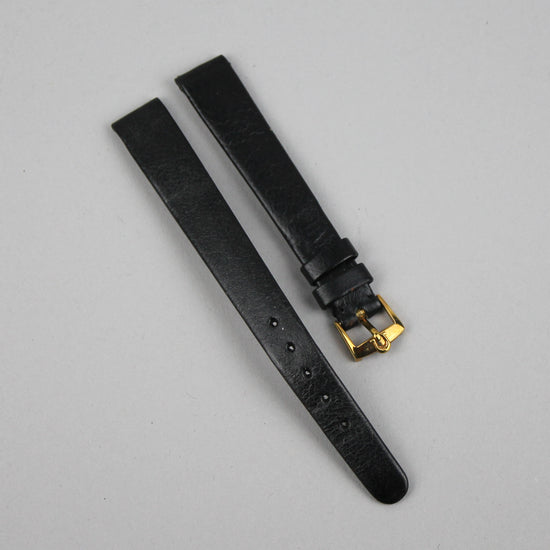 Käyttämätön Omegan nahkaranneke alkuperäisellä kullatulla soljella, joka sopii kokonsa puolesta naisten kelloihin. |