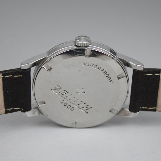 Zenith 2000 vetokello, jonka sisällä tikittää legendaarinen 135-koneisto. Lasikkeen sisäpuolella on muutama pölyhiukkanen. Taulu on ikäisekseen todella siistissä kunnossa. Pikkusekuntiosoitin on hiukan kärjestään vääntynyt. Kuorissa on iän sekä käytön tuomia jälkiä ja nuppi on alkuperäinen. Nahkaranneke on käytetty. Huoltohistoria ei ole tiedossa, mutta kello toimii. Jos se tulee päivittäiseen käyttöön on huollattaminen suositeltavaa. |
