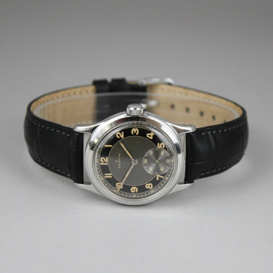 78-vuotias Zenithin vetokello harvinaisella bullseye-taululla. Kello on huollettu vuonna 2020 ja huoltodokumentti tulee kellon mukana. Taulun indekseissä ja osoittimissa on tasaista patinaa. Kuorissa on iän sekä käytön tuomia jälkiä ja nahkaranneke on käytetty. Kello toimii moitteettomasti. |