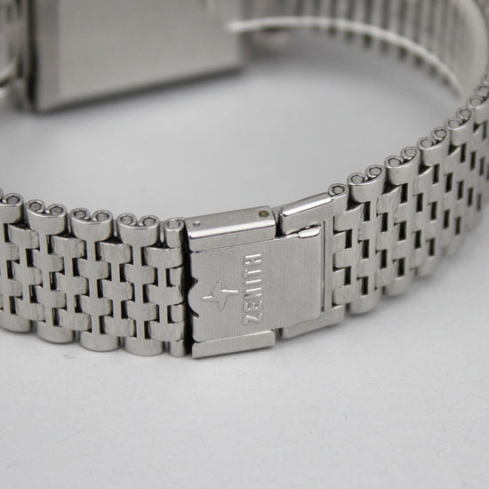 Zenith Respirator todella harvinaisella vihreällä taululla ja alkuperäisellä NSA:n valmistamalla teräsrannekkeella. Ranneke mahtuu noin 20 cm paksuun ranteeseen. Taulussa on pieni jälki klo 12 paikkeilla. Kuorissa on iän sekä käytön tuomia jälkiä ja nuppi on alkuperäinen. Huoltohistoria ei ole tiedossa, mutta kello toimii hienosti. Päivyri vaihtaa ja heittoa kellon käynnissä on noin 10 sekuntia vuorokaudessa. |