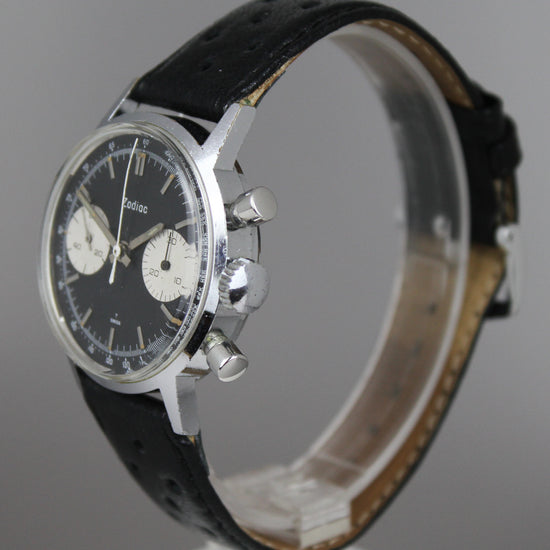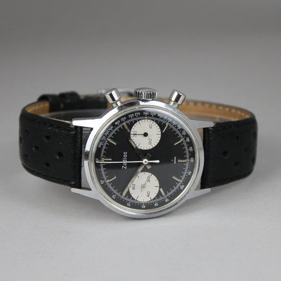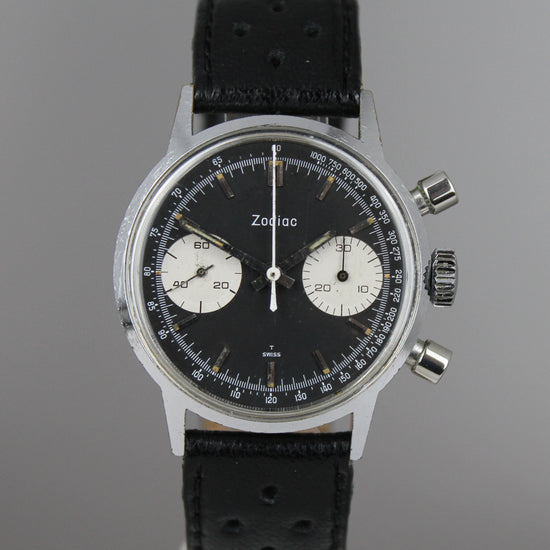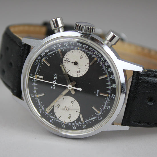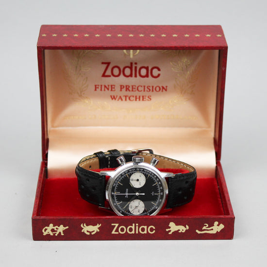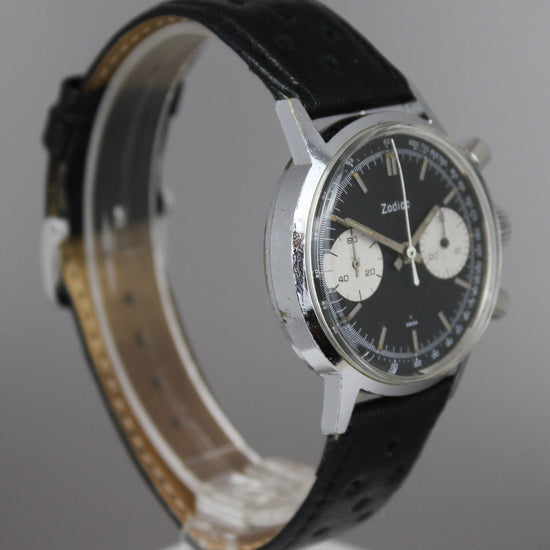 Hienolla mustavalkoisella värityksellä oleva Zodiacin kronografi. Kello on huollettu noin kymmenen vuotta sitten Longitudilla ja sen mukana tulee Zodiacin kellolaatikko. Lasike on hyvässä kunnossa, ei isoja naarmuja tai halkeamia. Taulu on ikäisekseen hyvässä kunnossa ja tritium-lumet ovat patinoituneet. Kromatuissa kuorissa on iän sekä käytön tuomia jälkiä ja kulumaa. Nahkaranneke on käytetty. Kello ja sen ominaisuudet toimivat hyvin, ajanotto toimii ja palauttaa napakasti ja heittoa kellon käynnissä on muutamia sekunteja vuorokaudessa. |